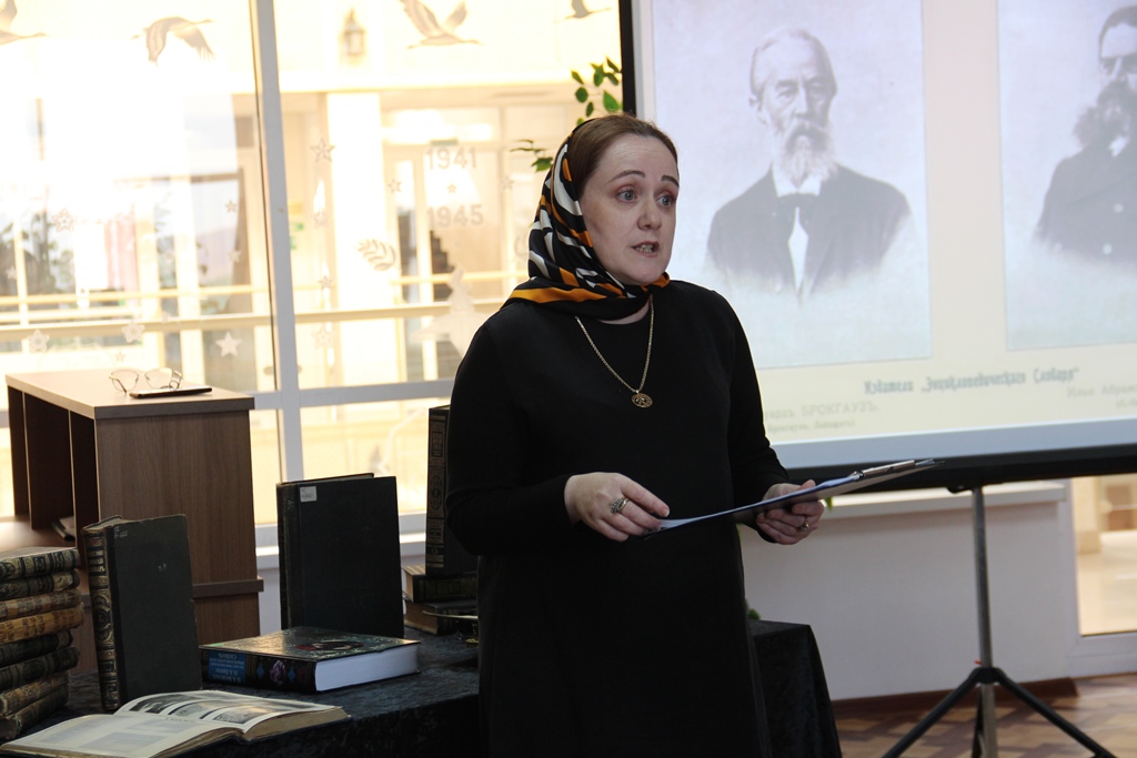 Заведующая отделом Эльза Исламгириева рассказала учащимся о том, как создавался, кто работал над созданием первой универсальной энциклопедии на русском языке. Особый акцент она сделала на уникальности и качестве содержимого словаря. Ведущая обратила внимание аудитории на то, что над созданием статей трудился цвет российской интеллигенции: Дмитрий Менделеев, Владимир Соловьев, Александр Блок, Сергей Витте и многие другие. Благодаря их участию, даже спустя столетие словарь остается не просто справочным изданием, а полноценным литературным и историческим памятником.