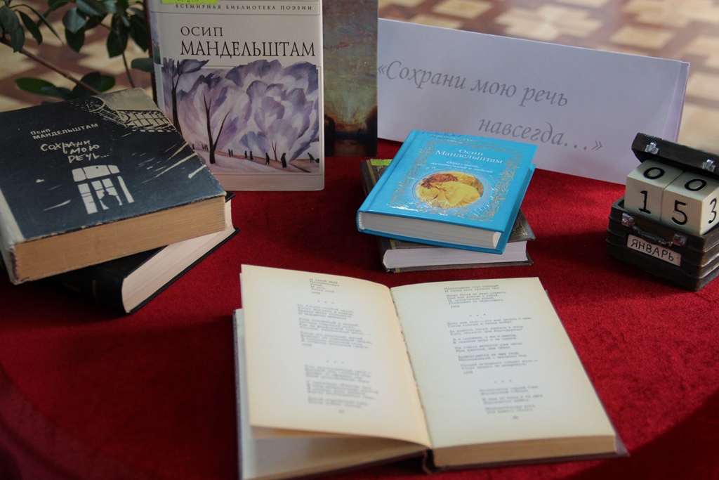 Вниманию читателей была представлена книжная выставка «Сохрани мою речь навсегда…», подготовленная к юбилею поэта. В экспозиции представлены издания стихотворений и прозы О. Э. Мандельштама, мемуарная литература и биографические исследования и др.